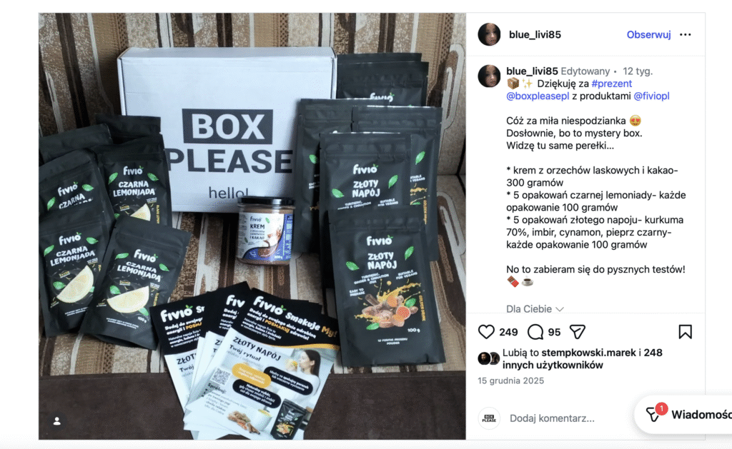 Zwiększenie świadomości marki na konkurencyjnym rynku zdrowej żywności to zawsze duże wyzwanie. Marka fivio, która z powodzeniem sprzedaje już swoje wyroby, postanowiła bliżej przyjrzeć się opiniom konsumentów i sprawdzić, jak jej asortyment wypada w codziennym życiu odbiorców. Zamiast przepalać budżety na działania w ciemno, fivio postawiło na nasz innowacyjny model testowy Box Please, aby zbudować naturalny zasięg i ugruntować swoją pozycję. Przeprowadziliśmy akcję, dostarczyła twardych danych analitycznych i też wygenerowała pierwsze z polecenia, realne zamówienia.