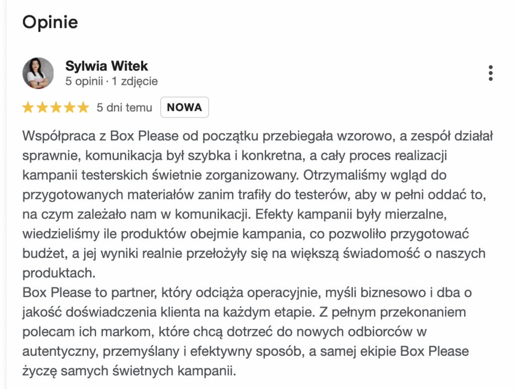 Współpraca z marką fivio dobitnie potwierdza, że nasze kampanie to doskonały sposób na wzmocnienie wizerunku i naturalne poszerzenie grona klientów. Zespół fivio zyskał nie tylko szczegółowe raporty analityczne, ale przede wszystkim realnych, powracających kupujących oraz dziesiątki wspaniałych recenzji, gotowych do wykorzystania we własnej komunikacji.